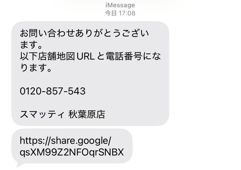 ショートメールに記載された系列店が「スマッティ 秋葉原店」であることを確認。